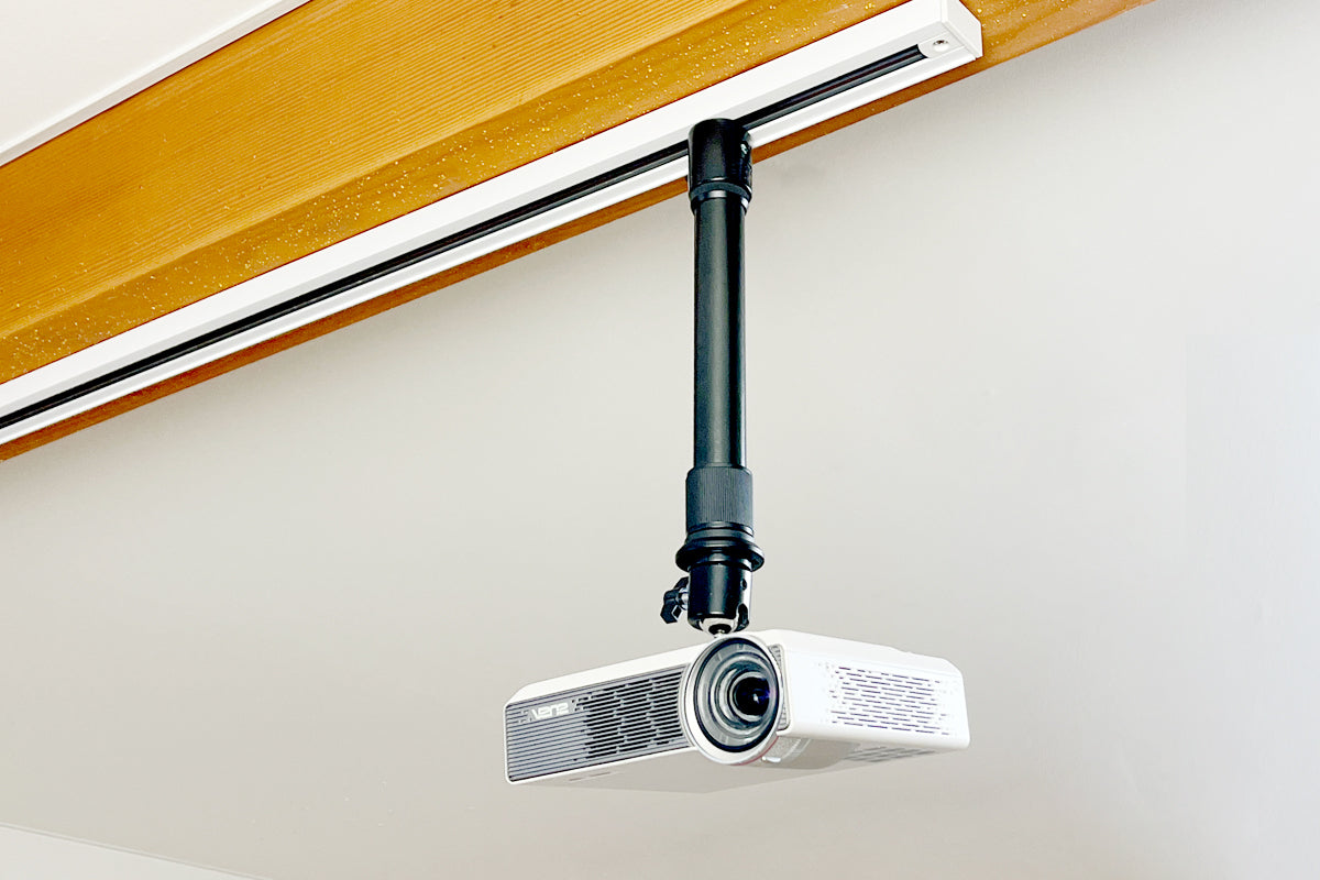 ライティングレールを使用してプロジェクターを簡単に天吊りできる!天井や壁に傷を付けず、工具も一切不要です。 テープルや三脚を立てる手間とスペースを解消!天井吊りならもっと大きく、天井への投影もできます。 |