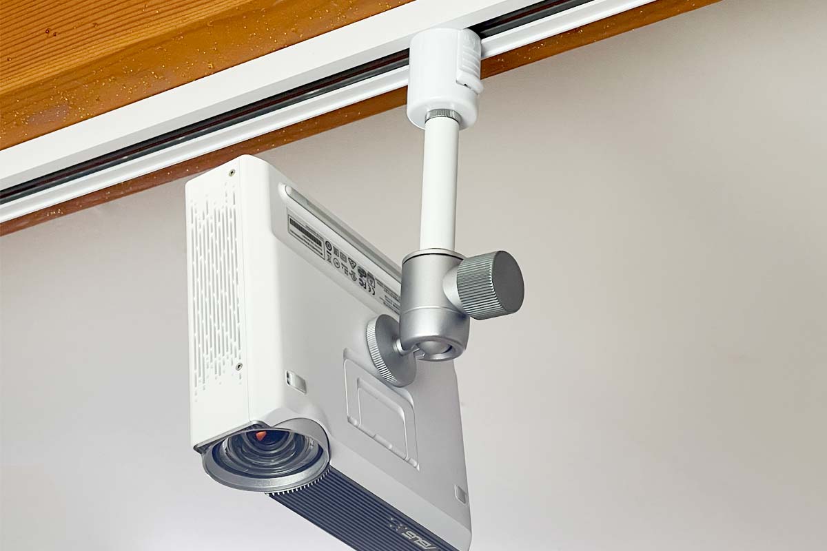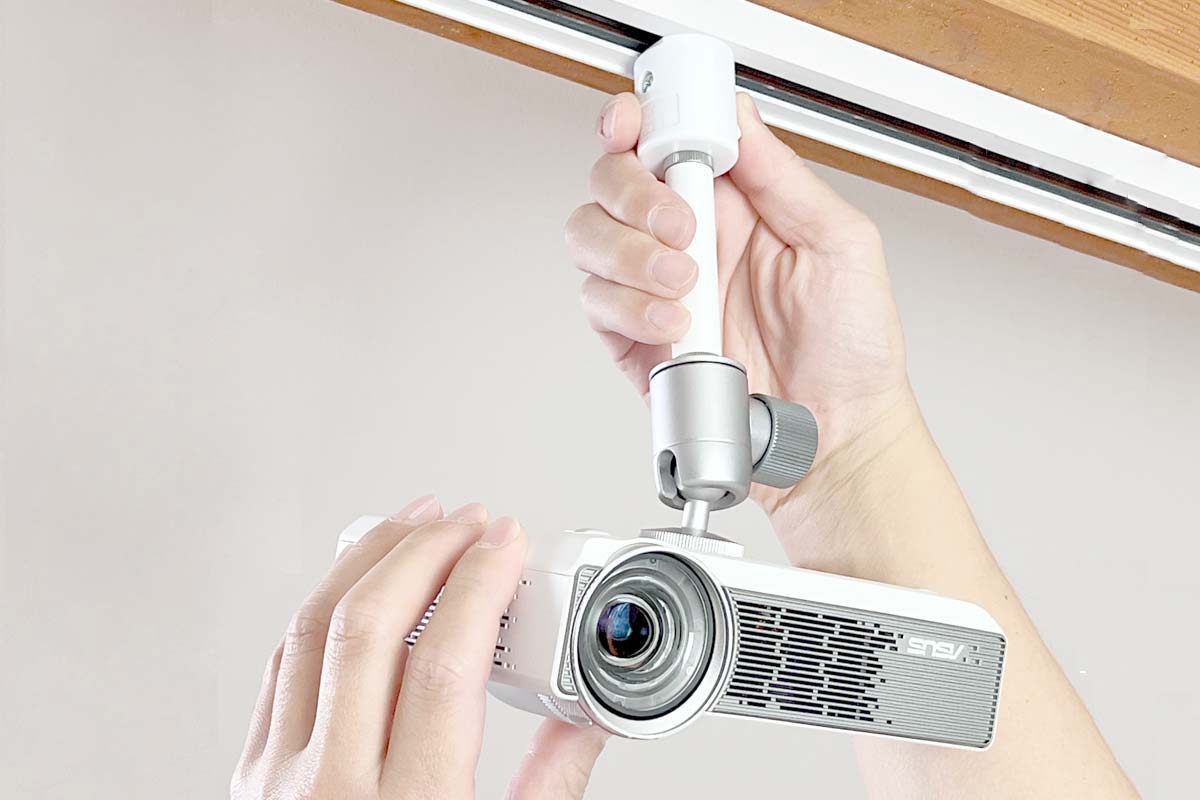 三脚ネジ穴があれば、工具も一切不要。小型プロジェクターの底面にあるネジ穴に接続して、ライティングレール(ダクトレール)に回して吊るすだけ!