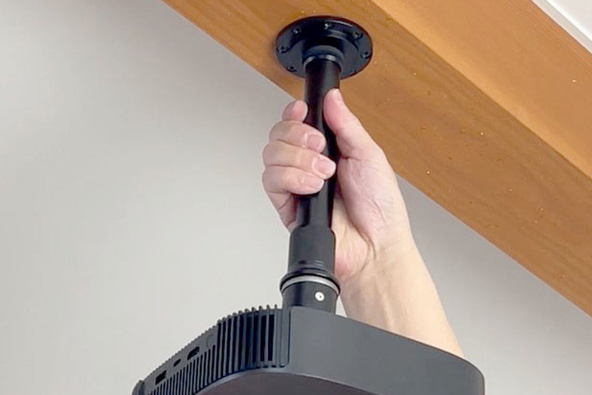 プロジェクターの三脚用ネジ穴(1/4インチネジ)に本製品を取り付け、回すだけで簡単に天吊り設置ができます。 |